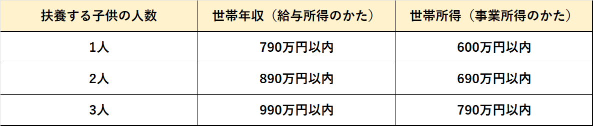 利用条件は、融資の対象となる学校に入学・在学する生徒・学生の保護者で、給与所得者の場合は世帯年収が、また事業主のかたは世帯所得が下表に当てはまる必要があります。この世帯年収・世帯所得には、配偶者などの年収(所得)も含まれます。